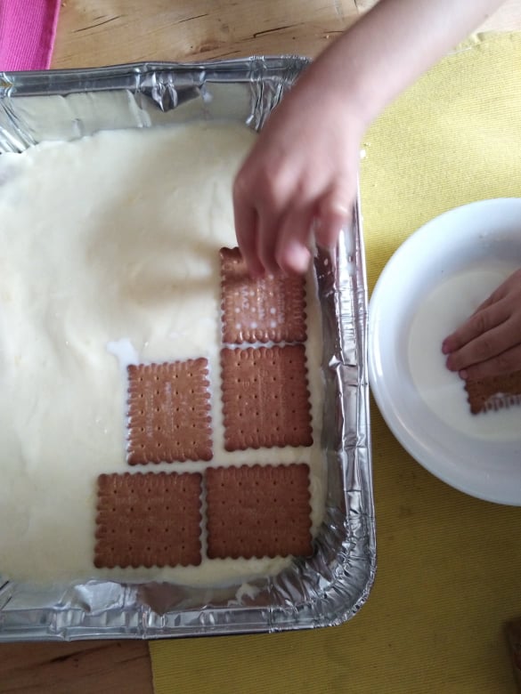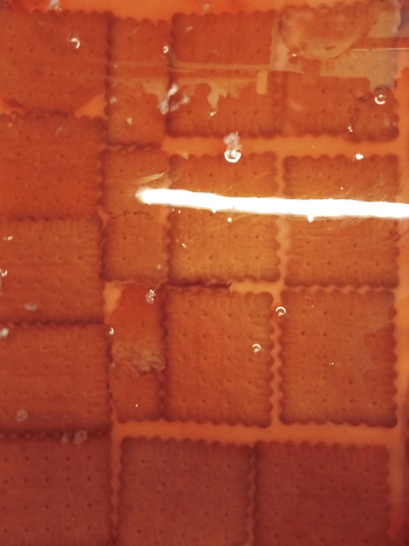 ΠΡΟΣΟΧΗ: Δεν πρέπει να απλώσουμε το ζελέ όσο είναι ακόμη ζεστό, ή να είναι ζεστή η κρέμα, γιατί το ζελέ θα περάσει κάτω από τα μπισκότα και θα τοποθετηθεί όλο στον πάτο του ταψιού! Βέβαια, και σε αυτή την περίπτωση δεν ήρθε και το τέλος του κόσμου! Σερβίρουμε το γλυκό ανάποδα…