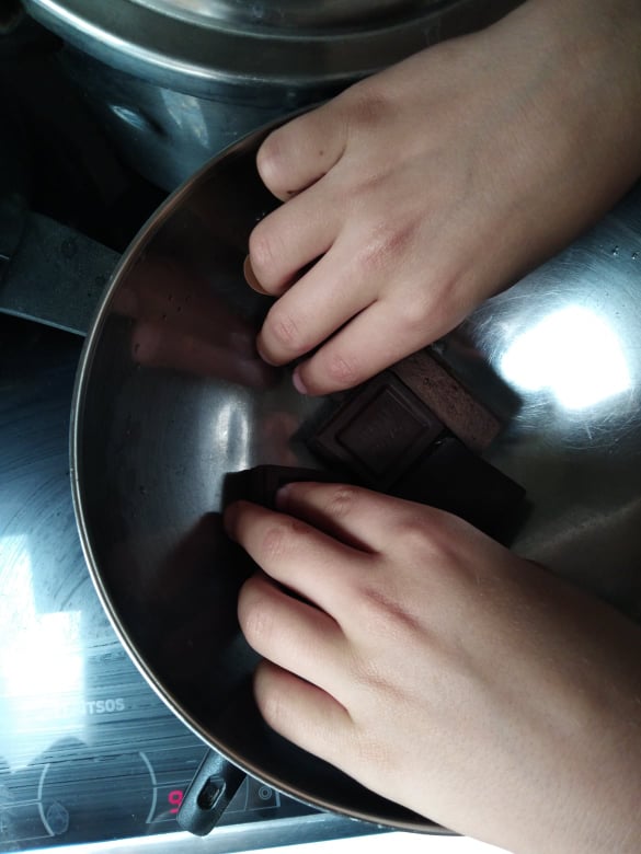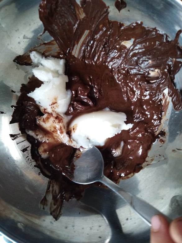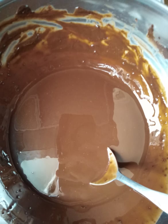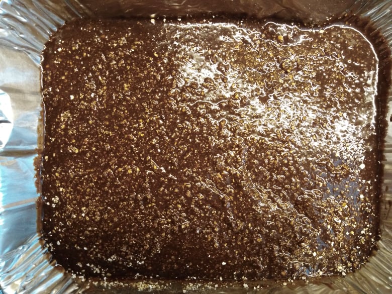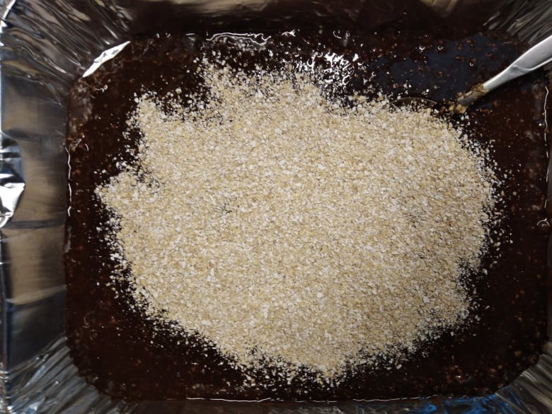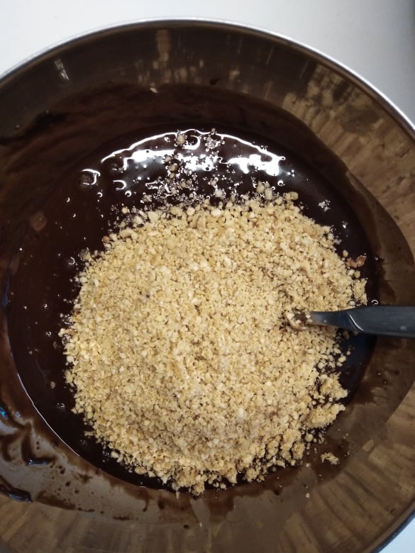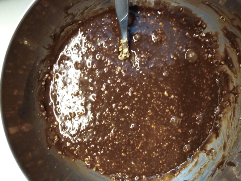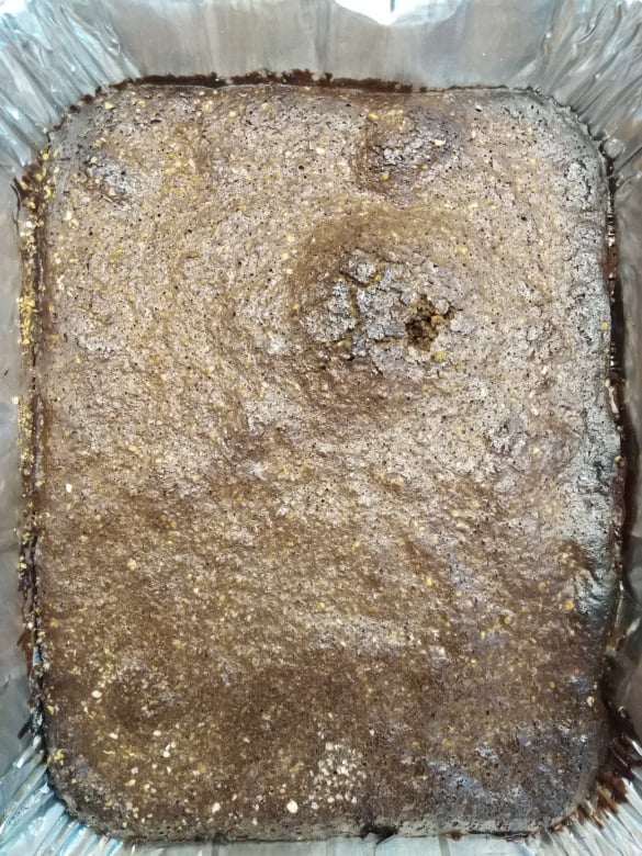 Ξεκίνησα, λοιπόν, με μια γλυκιά σοκολατένια απόλαυση: Brownies! Αλλά, το έφτιαξα με παραλλαγμένη δική μου συνταγή, για να βγει πιο υγιεινό! Χρησιμοποίησα λάδι καρύδας (3 γεμάτες κουταλιές), αντί για βούτυρο αγελάδος και πίτουρο βρώμης, αντί αλεύρι! Πρόσθεσα λιωμένη κουβερτούρα, 4 αυγά και τριμμένα φουντούκια (περίπου 100γρ.)! Ανακάτεψα όλα τα υλικά μαζί και άπλωσα το μείγμα σ’ ένα ταψάκι! Το έψησα για μισή ώρα -όχι παραπάνω- για να είναι ζουμερό εσωτερικά! Εντάξει, το παραδέχομαι: έπρεπε να το βγάλω λίγο νωρίτερα, αλλά και πάλι είναι νοστιμότατο!