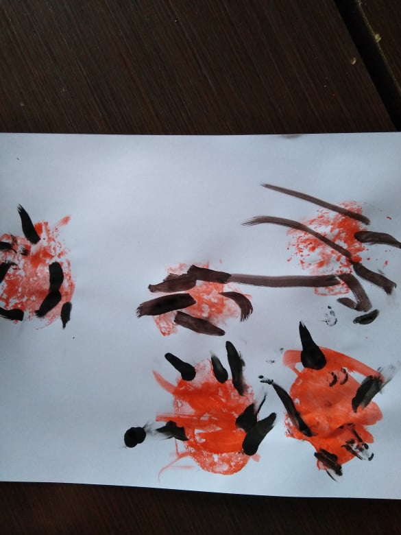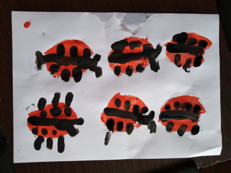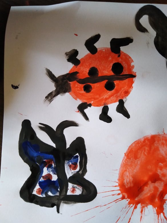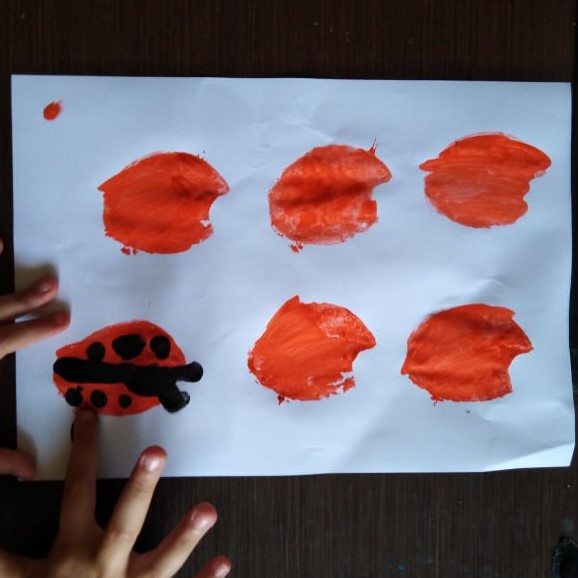 Φτιάχνουμε πασχαλίτσες – ladybugs, αποτυπώνοντας την πατάτα – σφραγίδα πάνω σε χαρτί. Με μαύρο χρώμα νερομπογιάς, κάνουμε τις τελευταίες πινελιές (βούλες, κεραίες).