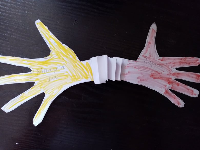 Συνεχίζουμε με το ίδιο μοτίβο της παλάμης και αυτή τη φορά σχεδιάζουμε δυο, τις οποίες ενώνουμε σαν φυσαρμόνικα που ανοιγοκλείνει! Ανοίγει για να πάρει μια μεγάλη αγκαλιά τον μπαμπά και μετά κλείνει!