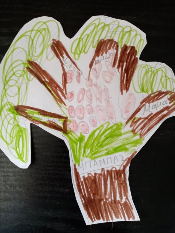 Η ιδέα ήταν της μεγάλης μου κόρης (5,5 ετών) που το είχε μάθει στον παιδικό σταθμό! Σχηματίζουμε σ’ ένα χαρτί – κόλλα Α4 την παλάμη μας και μετά την μετατρέπουμε σε δέντρο! Τα δάχτυλα είναι τα κλαδιά και πάνω από αυτά ζωγραφίζουμε τα φύλλα! Κι επειδή το μήλο κάτω από τη μηλιά θα πέσει, ζωγραφίζουμε και τα μηλαράκια του! Ο κορμός του δέντρου είναι ο μπαμπάς και στα κλαδιά του όλη η οικογένεια!