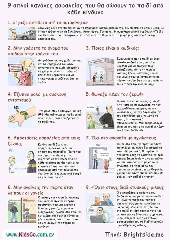 Εδώ και μέρες ήθελα να γράψω ένα άρθρο για τα παιδιά που εξαφανίζονται καθημερινά στην χώρα μας, αλλά και διεθνώς, με αφορμή τα πρόσφατα περιστατικά! Επειδή το θέμα είναι πολύ λεπτό, θλιβερό και ντροπιαστικό για το ανθρώπινο είδος, δεν ήξερα πώς να ξεκινήσω! Μέχρι που η φίλη μου η Κατερίνα -λες και είχε διαβάσει τη σκέψη μου- μου έστειλε την παρακάτω φωτογραφία από το Brightside.me, η οποία πρέπει να αποτελεί οδηγό για κάθε γονιό! Έτσι, θα ξεκινήσω με αυτήν!