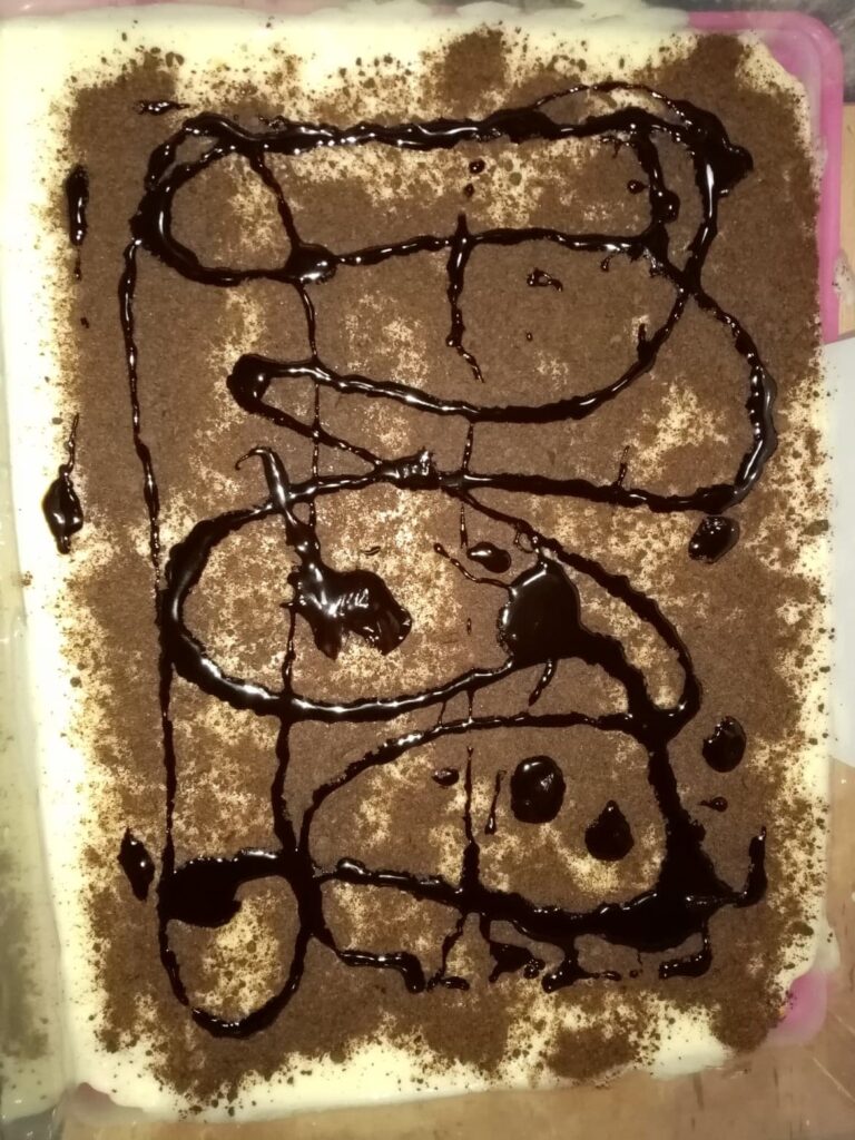Λιώνουμε λίγη κουβερτούρα και περιχύνουμε πάνω από την κρέμα.