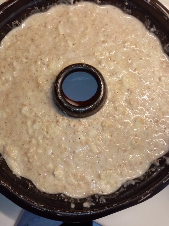 Βουτυρώνουμε μια φόρμα κέικ (με βούτυρο καρύδας) και ρίχνουμε μέσα το μείγμα. Ψήνουμε σε προθερμασμένο φούρνο στις αντιστάσεις στους 180 βαθμούς για περίπου 45′ – 50′. Απαραίτητο το τεστ με το μαχαίρι.