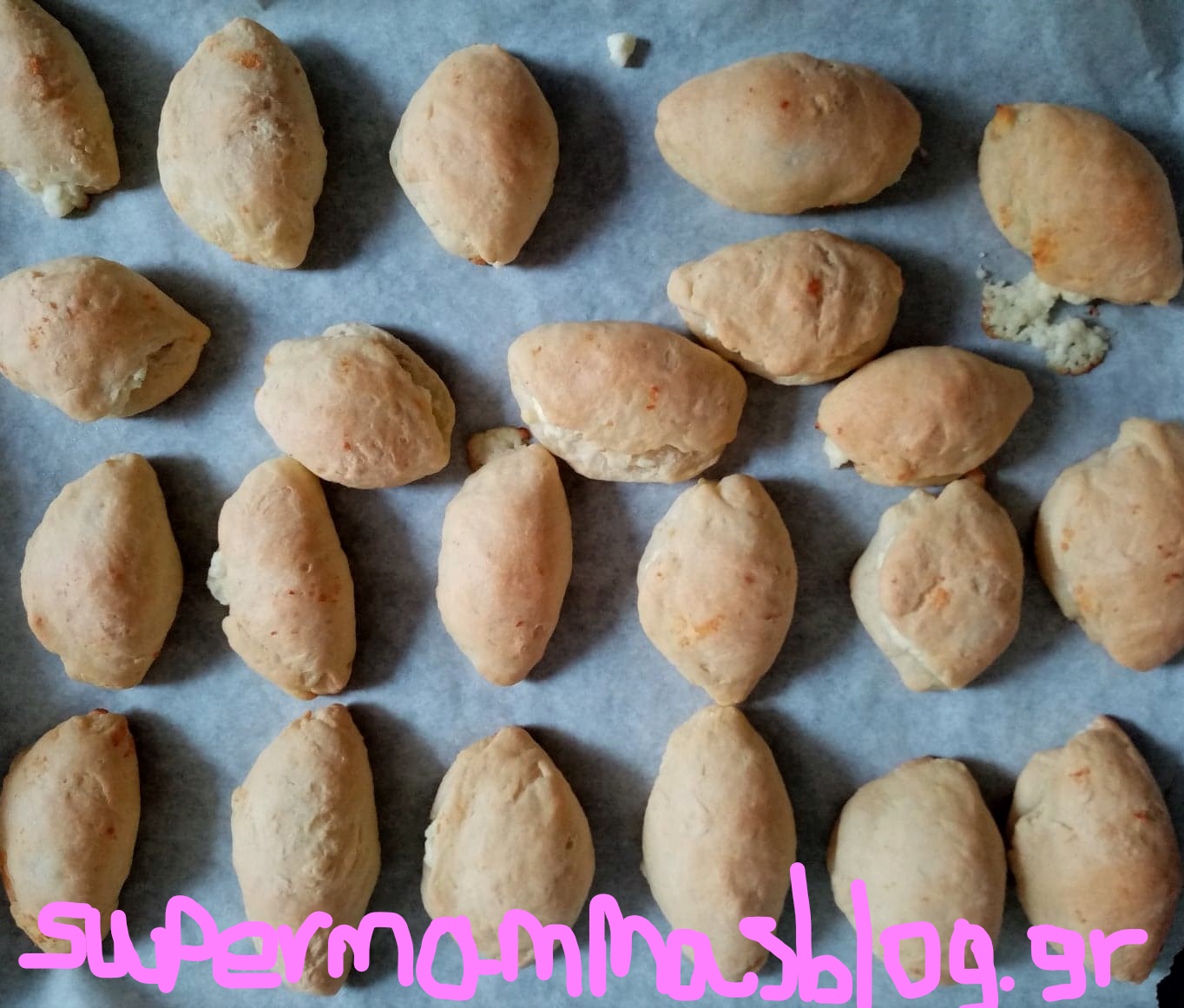 - Παίρνετε λίγη ζύμη κάθε φορά, πατάτε με τον αντίχειρα στη μέση και τοποθετείτε μέσα λίγη ποσότητα φέτας. Σκεπάζετε ώστε να σχηματιστεί μισοφέγγαρο.