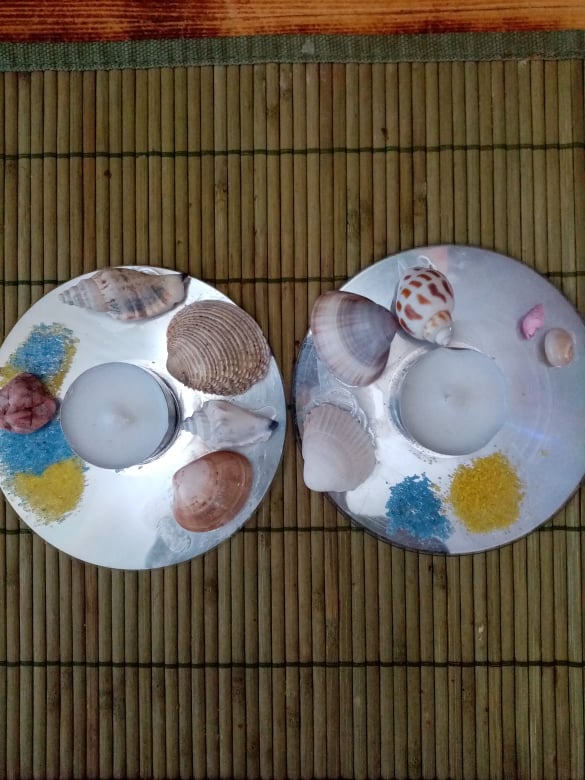 Κηροπήγιο για το μπαλκόνι από παλιά CD, κοχύλια και χρωματιστή άμμο