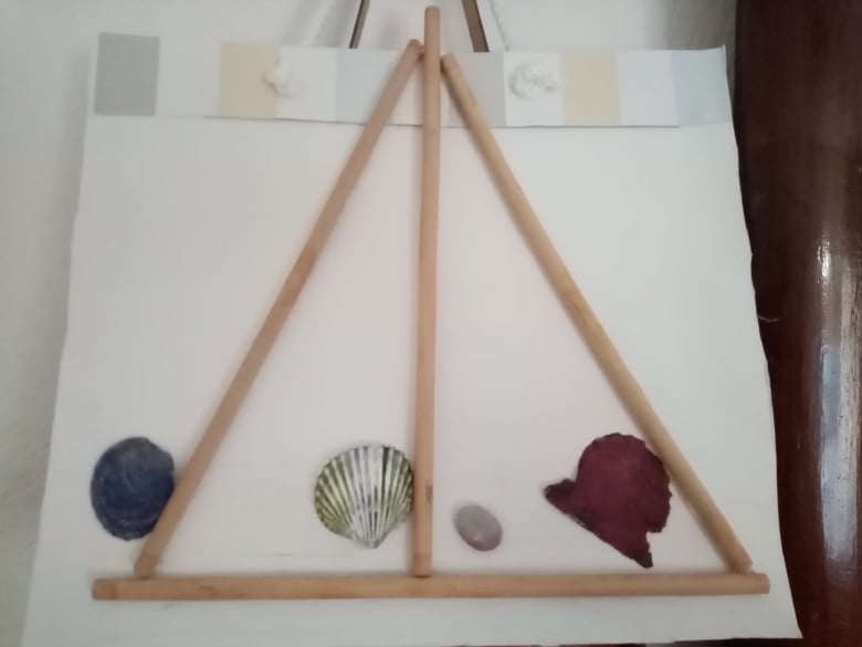 Κάδρο από χάρτινη τσάντα, με χρωματιστά κοχύλια και ξύλινο καραβάκι