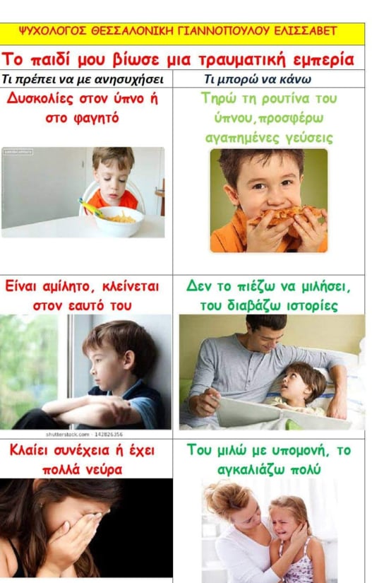 Σύμφωνα με την κα. Γιαννοπούλου, ένα παιδί που βίωσε ένα τραυματικό γεγονός, ενδεχομένως, να παρουσιάσει δυσκολίες στο φαγητό ή τον ύπνο, να κλείνεται στον εαυτό του, να κλαίει συνέχεια ή να έχει πολλά νεύρα! Αυτό που πρέπει να κάνει ο γονιός από την πλευρά του, είναι να του μιλά με υπομονή, να του διαβάζει πολλές ιστορίες, να τηρεί ένα πρόγραμμα όσον αφορά στον ύπνο ή το φαγητό και να το κάνει πολλές αγκαλιές!