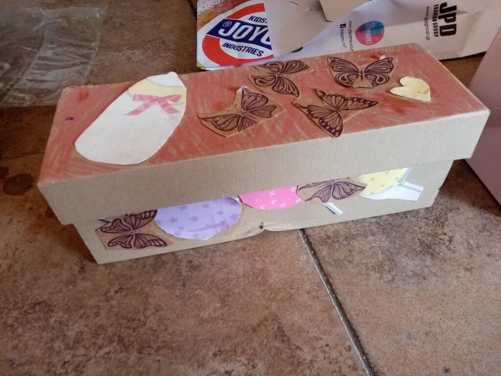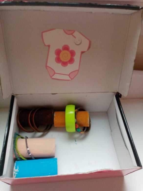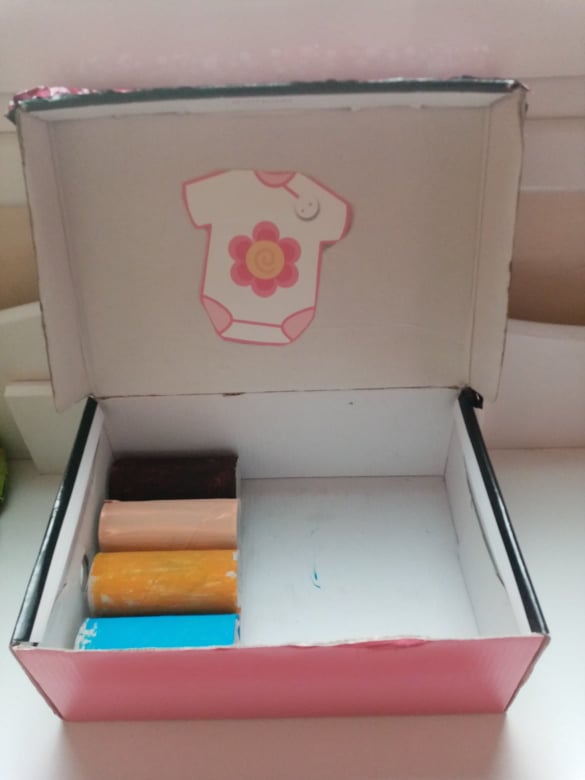 Το συγκεκριμένο είναι δημιουργία της μικρότερης κόρης μου (4,5). Έβαψε με χρώματα και πινέλο τα ρολά υγείας, έκοψε και κόλλησε το σχέδιο – ροζ μπλουζάκι, όπως και το χαρτί περιτυλίγματος πάνω στο ανοιγόμενο καπάκι του κουτιού.