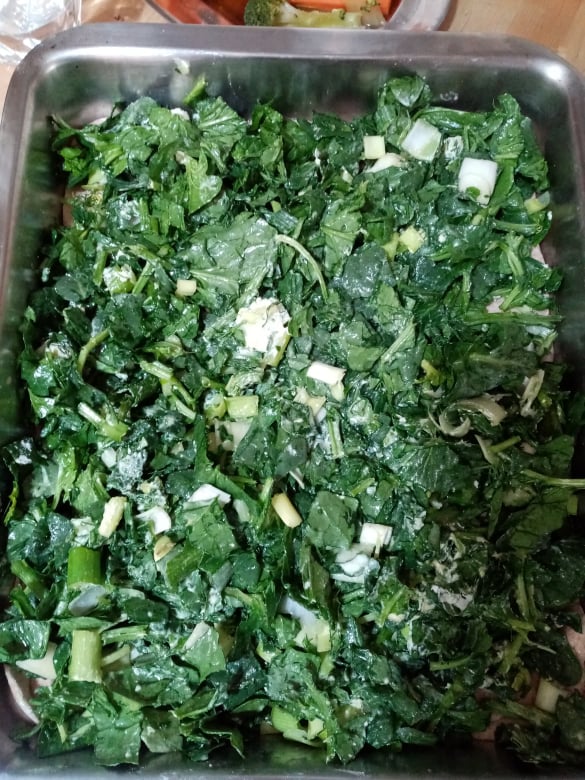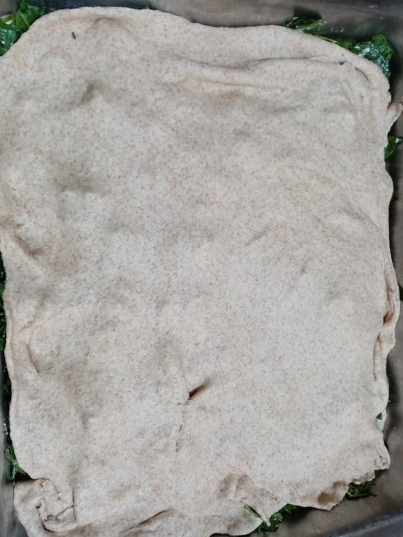 - Παίρνουμε τη μισή ζύμη και απλώνουμε σε πολύ καλά αλευρωμένη επιφάνεια. Ανοίγουμε μ’ έναν πλάστη σε ορθογώνιο σχήμα και βάζουμε προσεκτικά το φύλλο στο ταψί μας (αφού έχουμε λαδώσει λίγο τον πάτο του ταψιού).