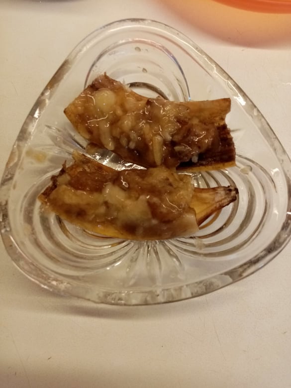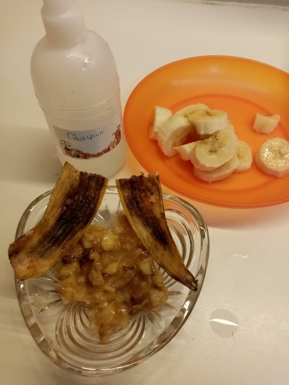 Καθαρίζουμε 1 ώριμη μπανάνα και τη λιώνουμε. Προσθέτουμε το τριμμένο γαρίφαλο και την γλυκερίνη. Προσοχή, δεν πετάμε την φλούδα… Την κόβουμε στη μέση και τοποθετούμε πάνω τους το μείγμα.