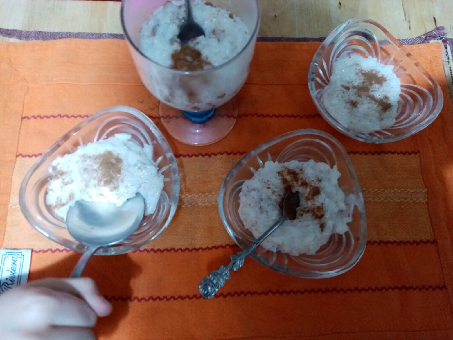 Αφού πάρει βράση, ρίχνουμε το καλά βρασμένο ρύζι μας και ανακατεύουμε για λίγο ακόμη μέχρι να πήξει (αν θέλετε μπορείτε να προσθέσετε λίγο κορν φλάουρ ως πηκτικό μέσο).