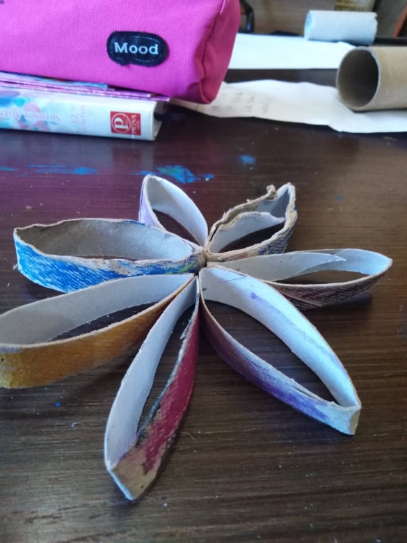 Παίρνετε ένα χάρτινο ρολό και το κόβετε σε ροδέλες. Τις χρωματίζετε όπως θέλετε και τις κολλάτε τη μια δίπλα στην άλλη! Το λουλουδάκι είναι έτοιμο! Η κόρη μου το έκανε με διαφορετικό τρόπο και πρόσθεσε και κοτσάνι…