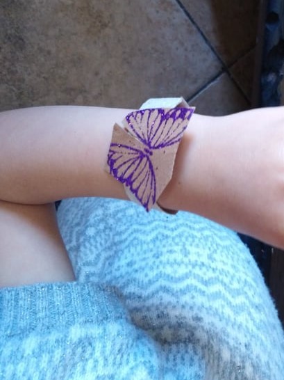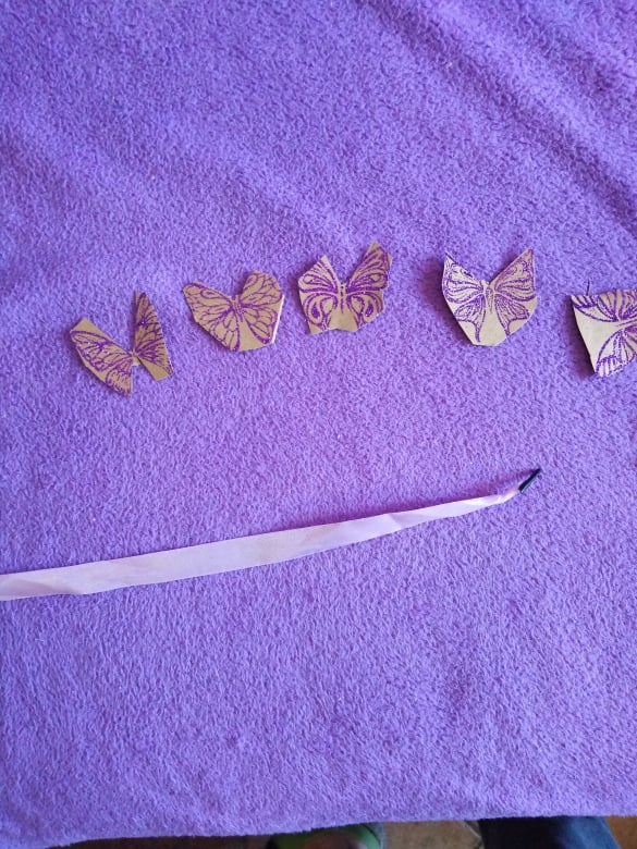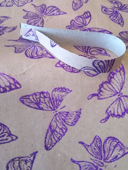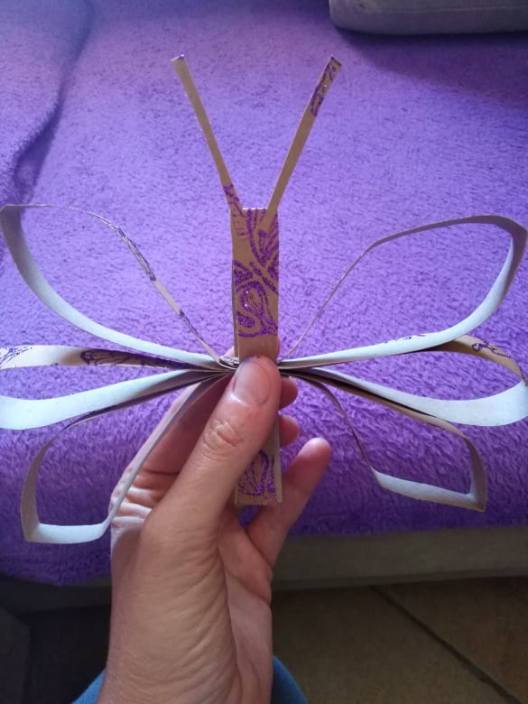 Κόβετε μια χάρτινη συσκευασία δώρου με ωραία σχέδια, που σίγουρα θα υπάρχει ξεχασμένη σε κάποιο ντουλάπι ή συρτάρι. Κόβετε μερικές λωρίδες και τις κολλάτε μεταξύ τους. Τοποθετείτε τρεις από τη μια πλευρά, τρεις από την άλλη και μια στη μέση! Βάζετε και δυο λεπτότερες λωρίδες για κεραίες κι έτοιμη η πεταλουδίτσα!